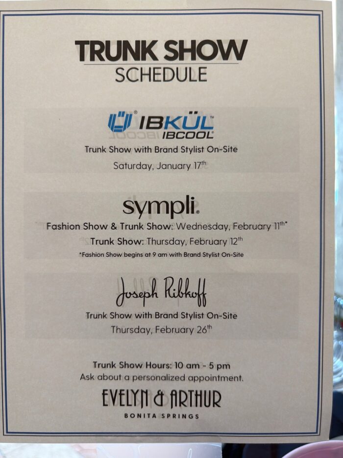 Evelyn and Arthur Trunk Show Schedule
